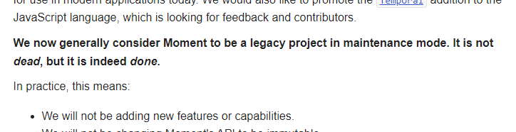 moment.js가 레거시 프로젝트로 공식적으로 선언이 되었습니다. 이번 소식은 아닐 수 도 있습니다만, 중요한 소식이고 영향력이 있는 소식이라 판단되어 공유 합니다.